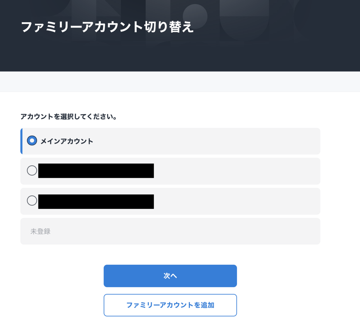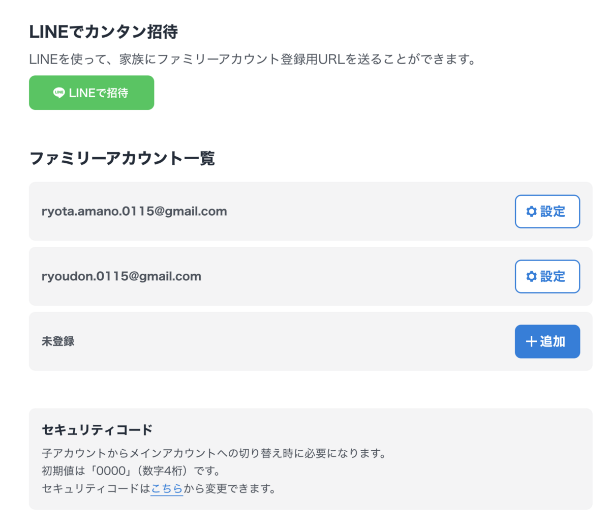 すでに別のアカウントがある場合はこの画面から切り替えができますが、この画像下側にある通り、ファミリーアカウントからメインアカウントへ切り替える際には4桁のセキュリティコードが必要になりますのでお気をつけください。