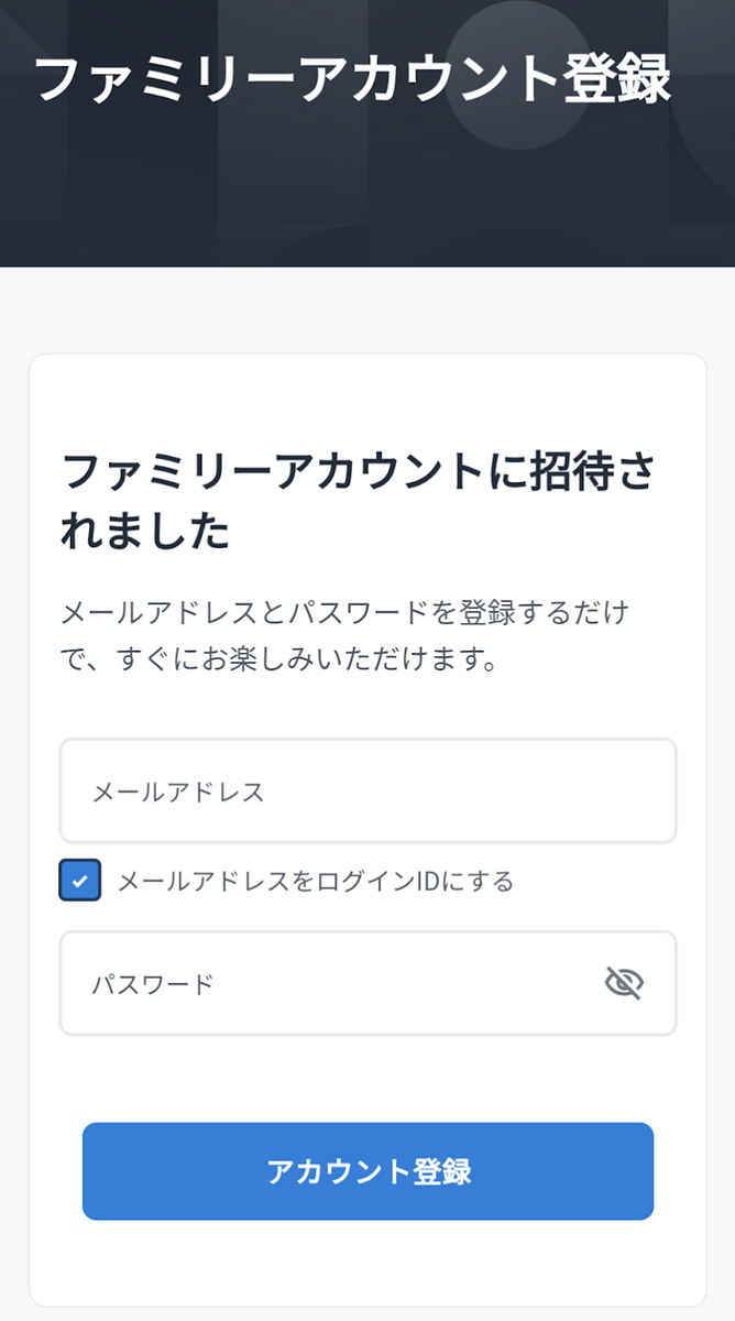ファミリーアカウント招待のページが下のようになっています。